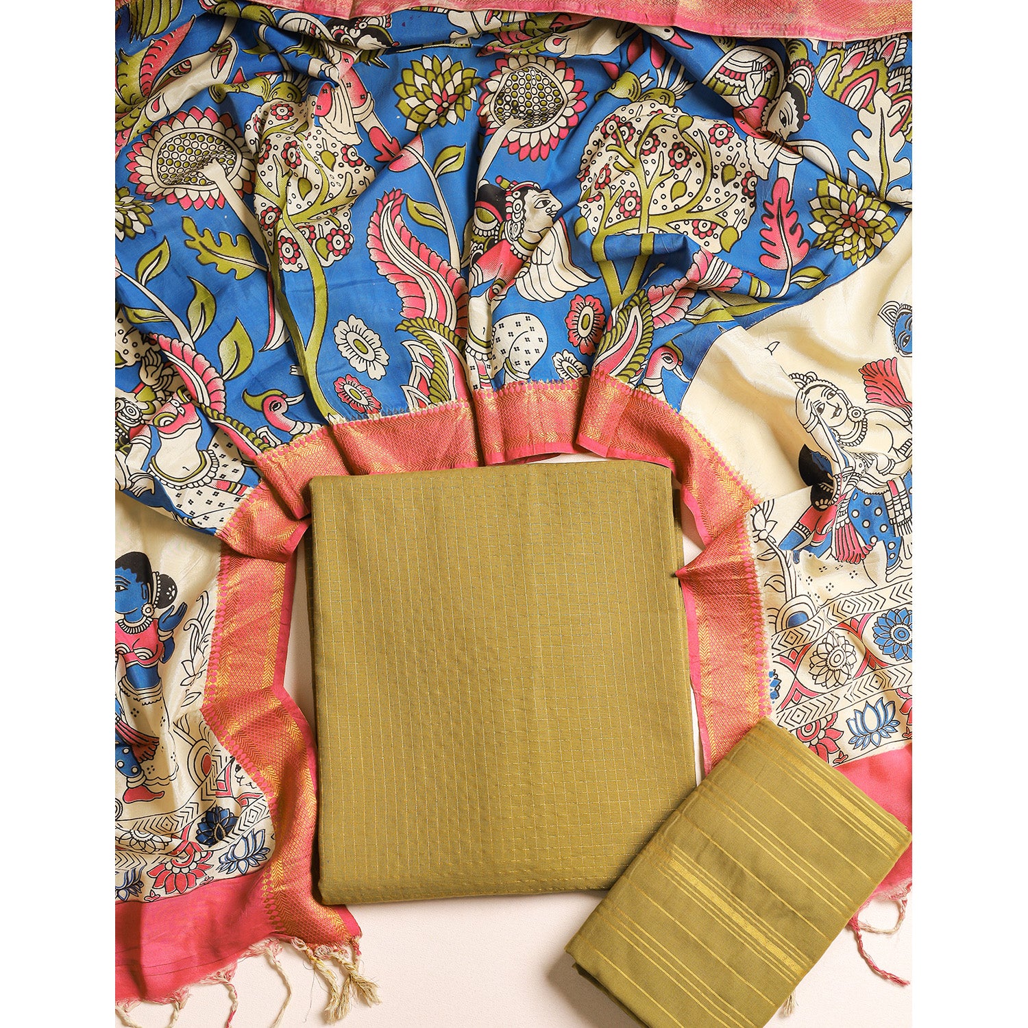 Embrace the allure of Cotton Suit Sets. Emanate your grace and elegance in our newly launched Cotton Handloom Lurex Top paired with matching Kalamkari Dupatta and Cotton Handloom Lurex Bottom . Enhance your ethereal charm and style it in your way !